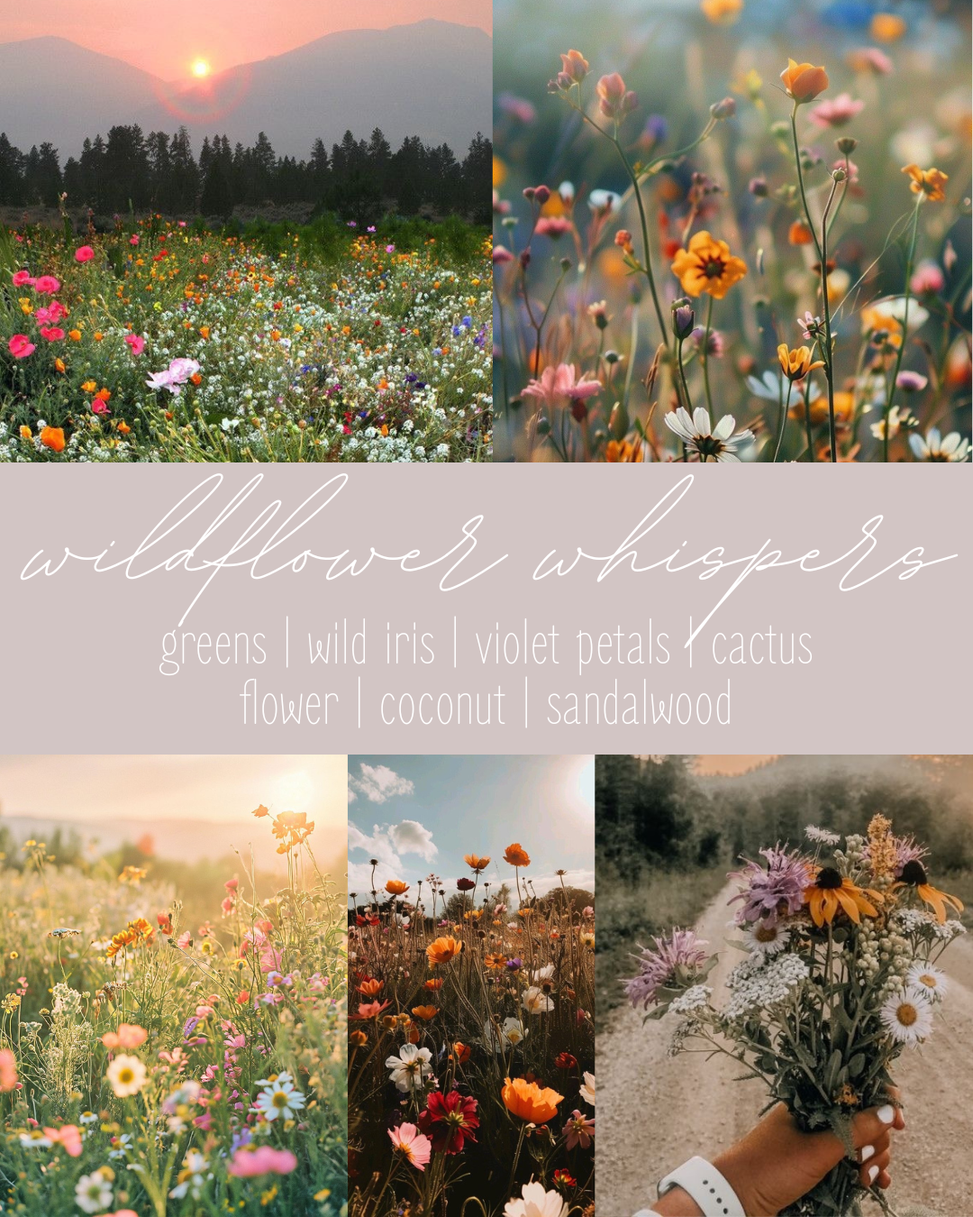 🌸 Wildflower Whispers – Soft and dreamy, this scent blends wildflowers, coconut, and vanilla to evoke sunlit fields, soft breezes, and the gentle hum of nature just beyond town.